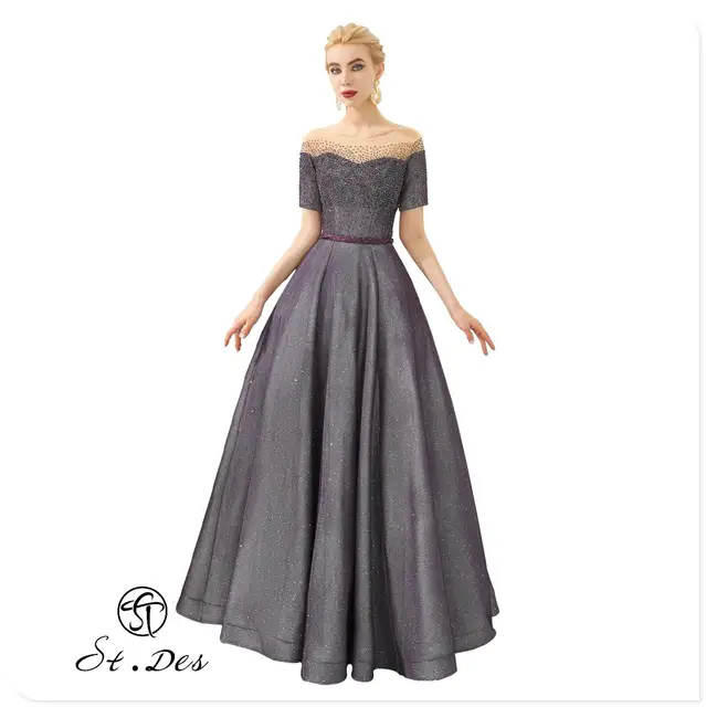 Discount Offer NEW 2020 St.Des Gray A-line Boat Neck Sweetheart Beading Diamond Short Sleeve Designer Floor Length Evening Dress Party Dress with Free Worldwide Shipping!